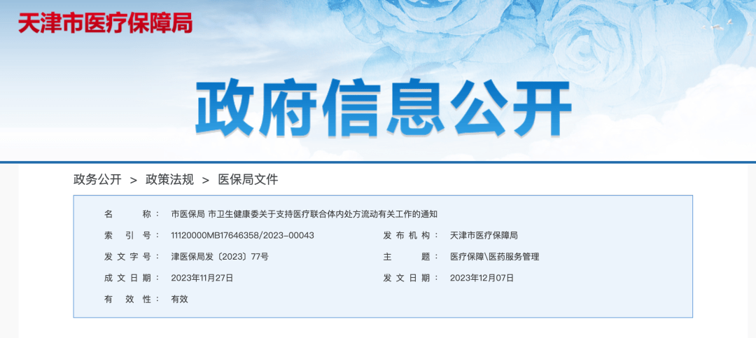 12 月 7 日,天津市医疗保障局发布关于支持医疗联合体内处方流动有关工作的通知,将于 2024 年 1 月 1 日起执行。