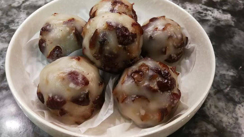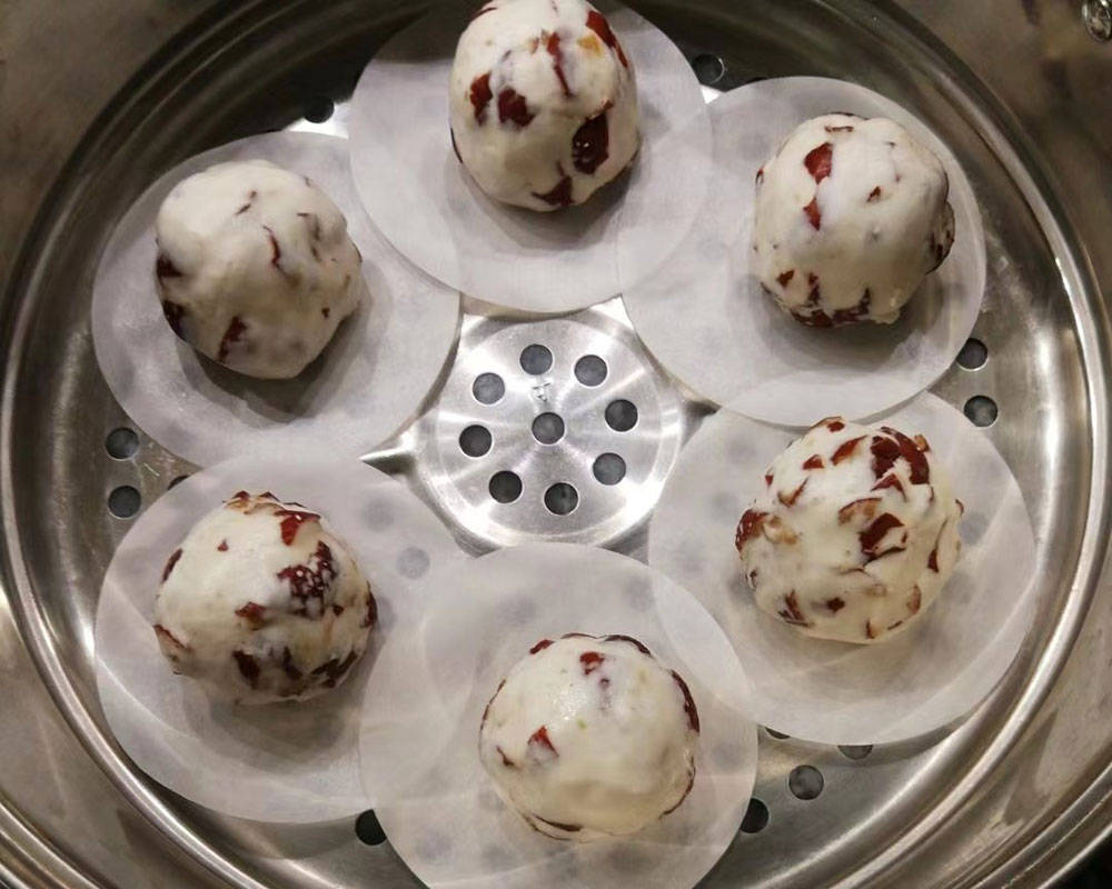 5、接着把红枣糯米团分成小份,每一份进一步团成球状,放到蒸屉中,最好铺上不粘纸,没有的可以铺菜叶或是刷油。接着开火,上汽之后蒸四十分钟关火。彻底晾凉之后,吃不完的装进保鲜袋,冷冻起来,每次吃的时候提前加热,跟现蒸的一样软糯可口。