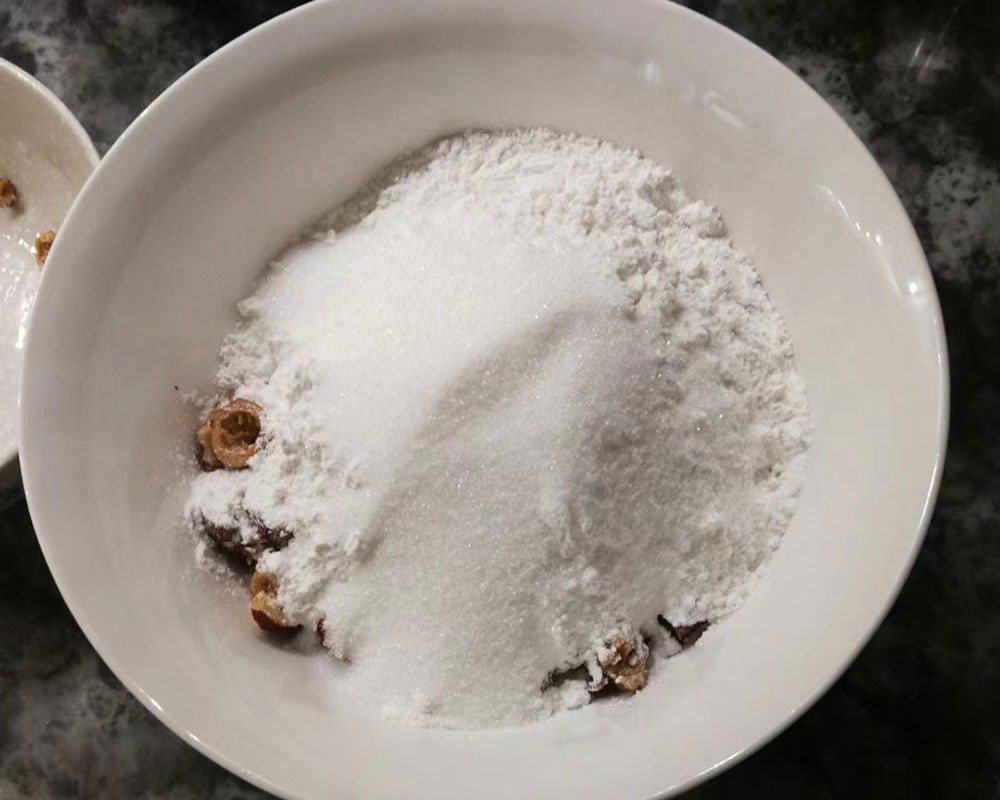 3、接着在红枣中加入糯米粉,为了增加甜度,可以再额外放些糖,将三种食物搅匀混合。