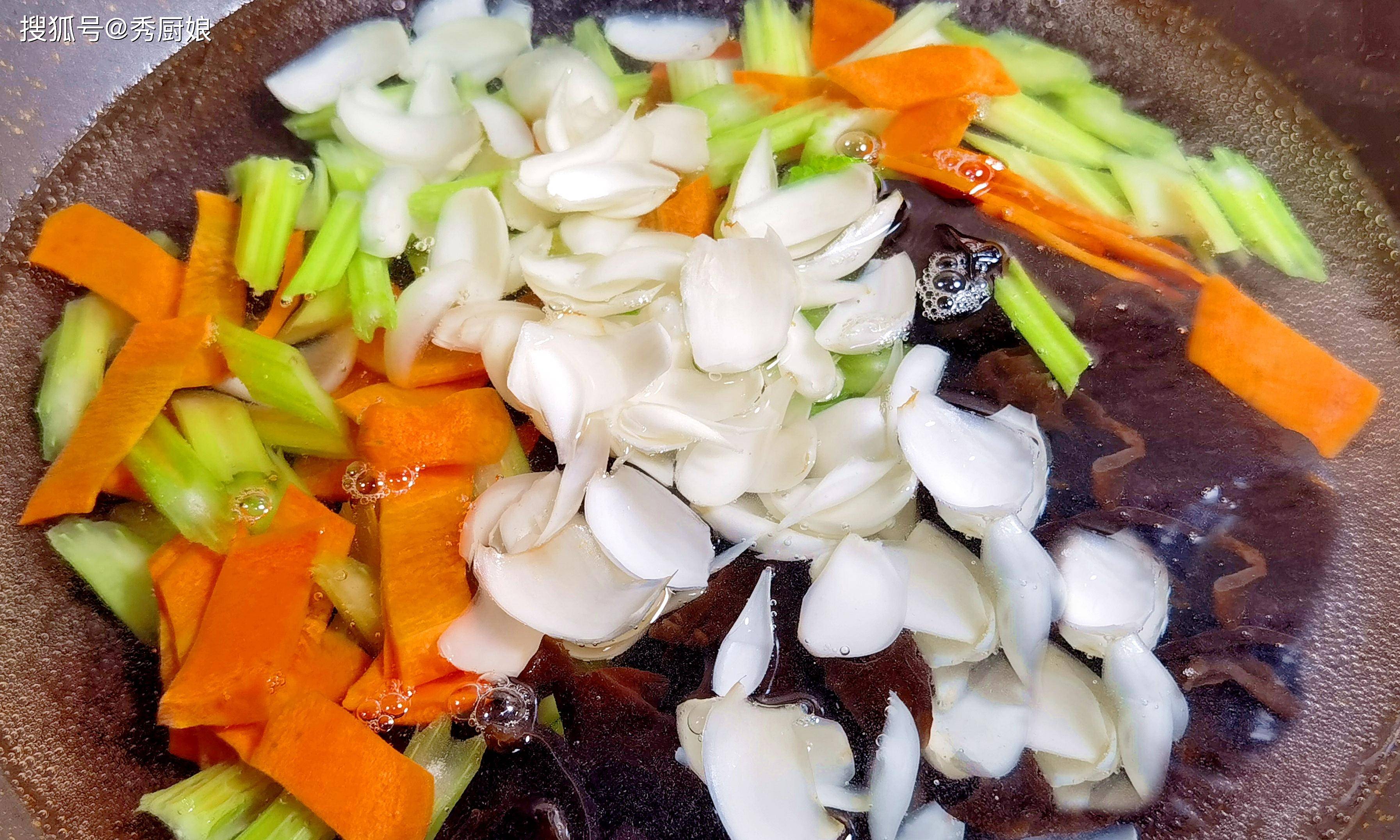 3. 锅中再倒入适量花生油,加入黑木耳、胡萝卜片翻炒至七成熟,加入鲜百合和鲜芹菜,继续翻炒,保持蔬菜的嫩脆口感。