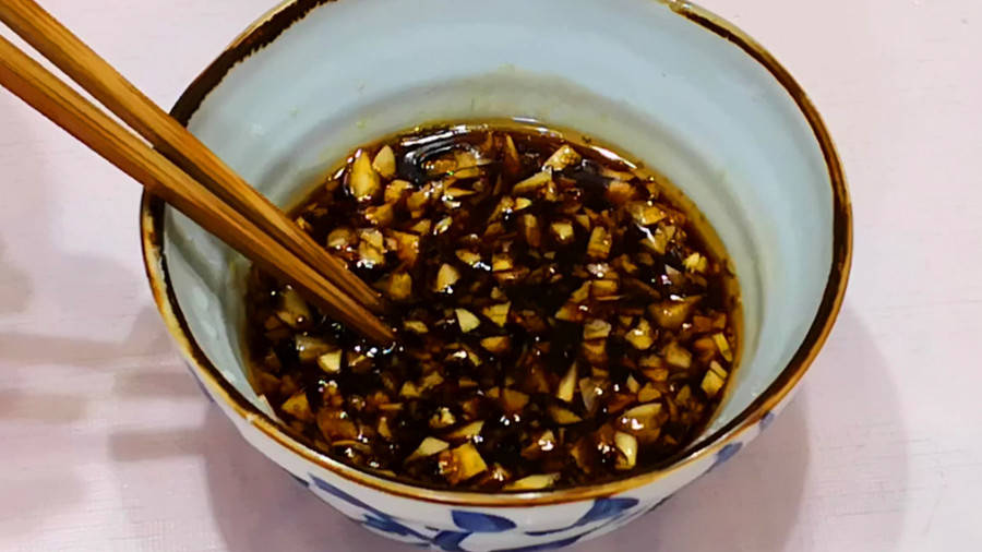4.接着调碗凉拌汁:碗中加入剁细的蒜末,再加入适量盐、白糖、味极鲜、香醋、香油,充分搅匀后备用。