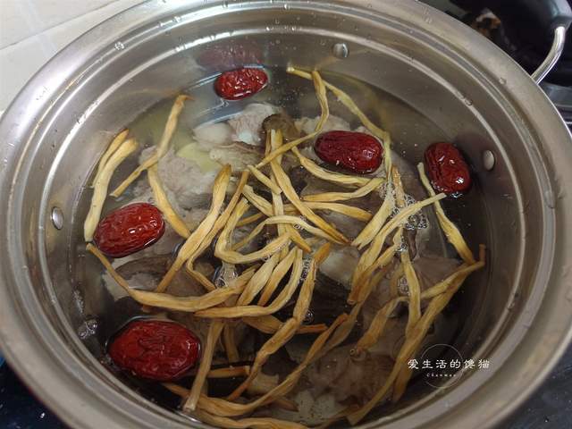 再把黄花菜和羊肚菌,红枣放入汤锅里,加入适量清水,放入米酒和姜片,大火煮沸转小火熬煮50分钟。