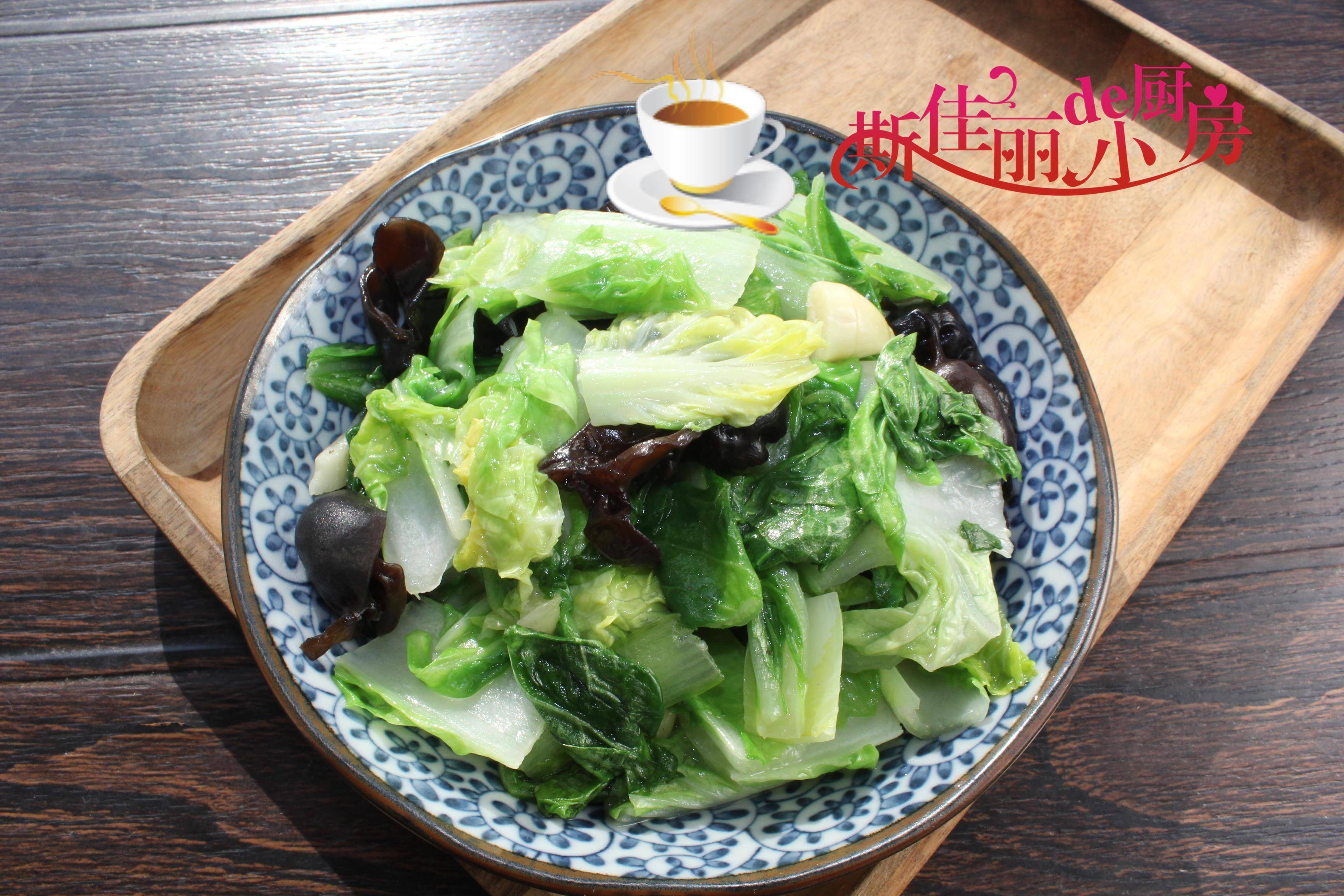 原料: 黑木耳 1小把 毛白菜 1盘 蒜蓉 1小碟 油盐 适量