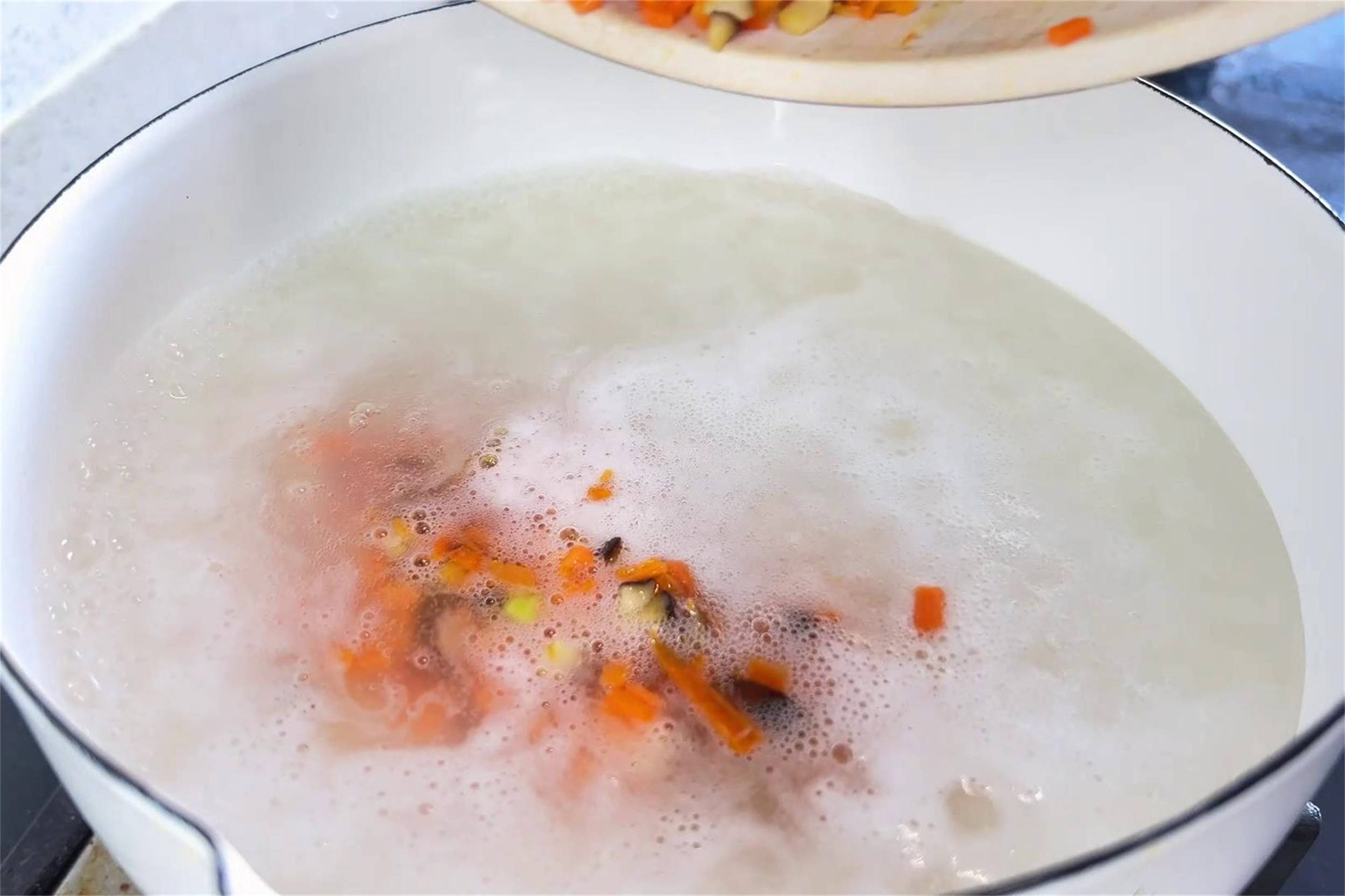 4、煮好的粥倒入煮锅中,炒好的胡萝卜和香菇与山药碎一同倒入煮锅中,搅拌均匀。