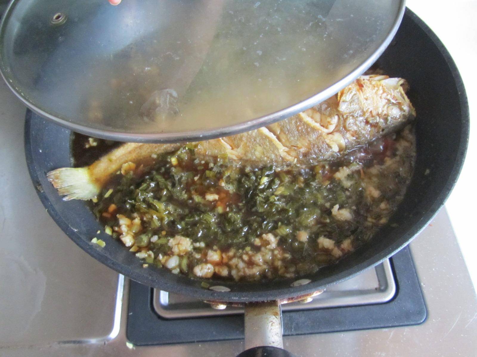 4. 加入雪菜末进锅煸炒两下,再将煎好的黄鱼放入锅中;