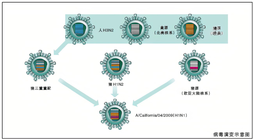 英国格拉斯哥大学病毒学家Hutchinson表示,引起 2009 年猪流感大流行的病毒是不同病毒的混合物:猪流感、人类流感和禽流感交换了基因进行了重新组合。不同的流感病毒混合后产生了一种能够跳入人类体内的病毒,这是一个异常复杂的混合和匹配版本。
